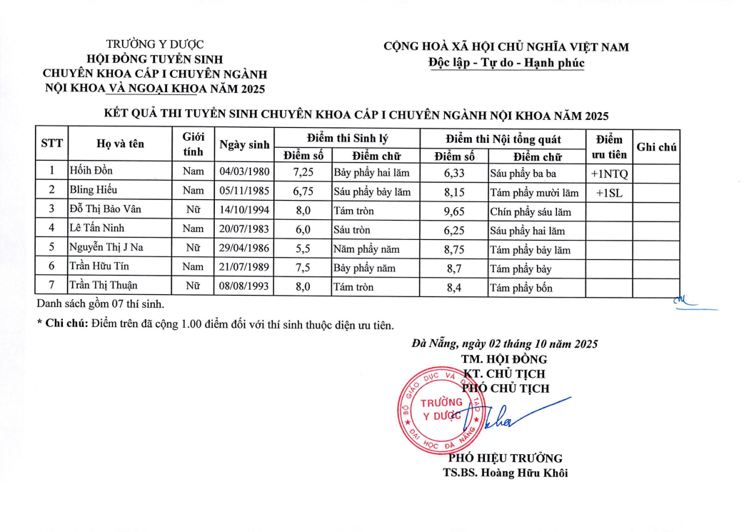 Kết quả thi tuyển sinh Chuyên khoa Cấp I chuyên ngành Nội khoa và Ngoại khoa năm 2025