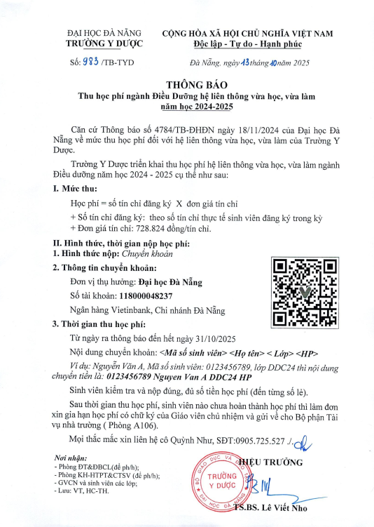 Thông báo Thu học phí ngành Điều dưỡng hệ liên thông VLVH năm học 2024-2025