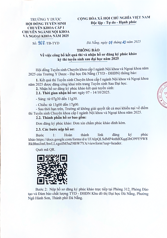 Thông báo về việc công bố kết quả thi và nhận hồ sơ đăng ký phúc khảo kỳ thi tuyển sinh sau đại học năm 2025